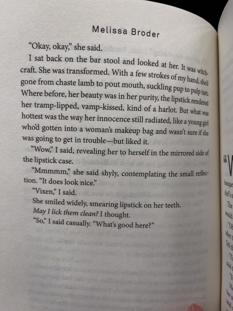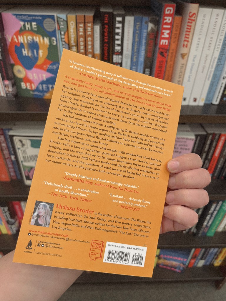 It’s interesting because this story starts with Rachel’s desire, in some way, to heal. But everything else about her mentality is so troubling! Broder writes about every little thing like worship. Every line is a decadent ode to something, whether that something is low-cal frozen yogurt with no toppings or the body of Miriam, the overweight orthodox jewish girl swirling the yogurt that Rachel becomes obsessed with. Everything is laced with this awe and desire, and the stylistic descriptions get dizzying and sometimes uncomfortable. There were sections of this book that made me miss the dangerous food habits that I and so many of my peers had but nobody talked about. It took me back to pro-ana tumblr and that Skinny Bitch book and earnestly saying things like “Whipped cream is for fat girls.” How good it felt to go to bed hungry, or sleep in so late that you skipped a meal. How good does writing have to be to make you miss yourself at your absolute worst?