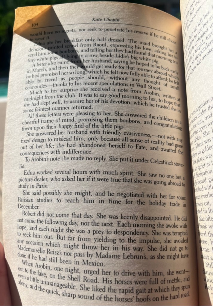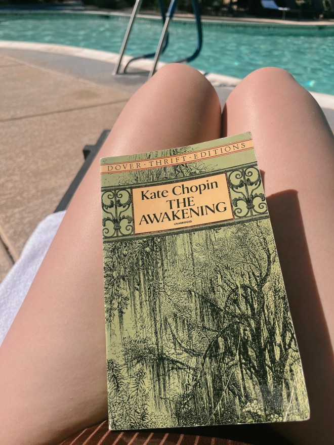Something that stood out to me on this read was the role of New Orleans mysticism. At one point, Chopin says, “Edna could hear the whispering voices of dead men and the click of muffled gold,” and sees “misty spirit forms were prowling in the shadows and among the reeds, and upon the water were phantom ships, speeding to cover” (p. 39). Small shining traces of magic lurk here and there, never commented on. I used to read these as metaphorical language, but now I’m not so sure. It felt, upon this read, more like the ghosts and magic in Toni Morrison’s Song of Solomon. Are we supposed to assign meaning and explanation to this interjections, or do we owe it to authors to take their word for it? Maybe this is supposed to be a symbol for Edna’s loosening grip on reality. For seeing things that others don’t. Personally, I like the idea of coexisting with ghosts and still being like, the real problem is this husband I’m stuck with!