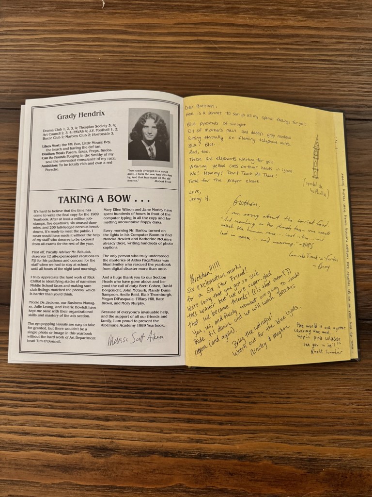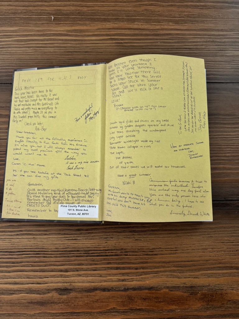 Also, can we talk about the format?! The yearbook signatures inside covers and about the author? chef’s kiss It’s 2024, let’s admit we’re judging the book by the cover!!! Next up: The Amazon prime movie I didn’t know existed!!!
